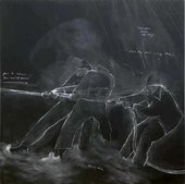 Tacita Dean's The Roaring Forties: Seven Boards in Seven Days 1997 (figs.1–2) is composed of seven eight-foot-square blackboard panels bearing white chalk drawings and fragments of written script. They describe the progress of a sea adventure, complete with raging storms, an imperilled crew and an eventual homecoming. The sequence begins with a minimally worked panel, annotated with a title at the top: 'Roaring Forties – an epic C19 sea movie', as well as some initial filmic cues: 'fade up from black', 'start'. The second board shows a crew of sailors clewing the sail ('long take'); in the third, the presence of a gliding albatross warns of what is to come: in the next two boards the vessel and its crew are in trouble, thrown and listing amidst a howling gale. By the sixth board, a close-up of the swell with no horizon, the storm has subsided, and the seventh and last board offers a happy ending as the surviving sailors row into frame and towards dry land.
